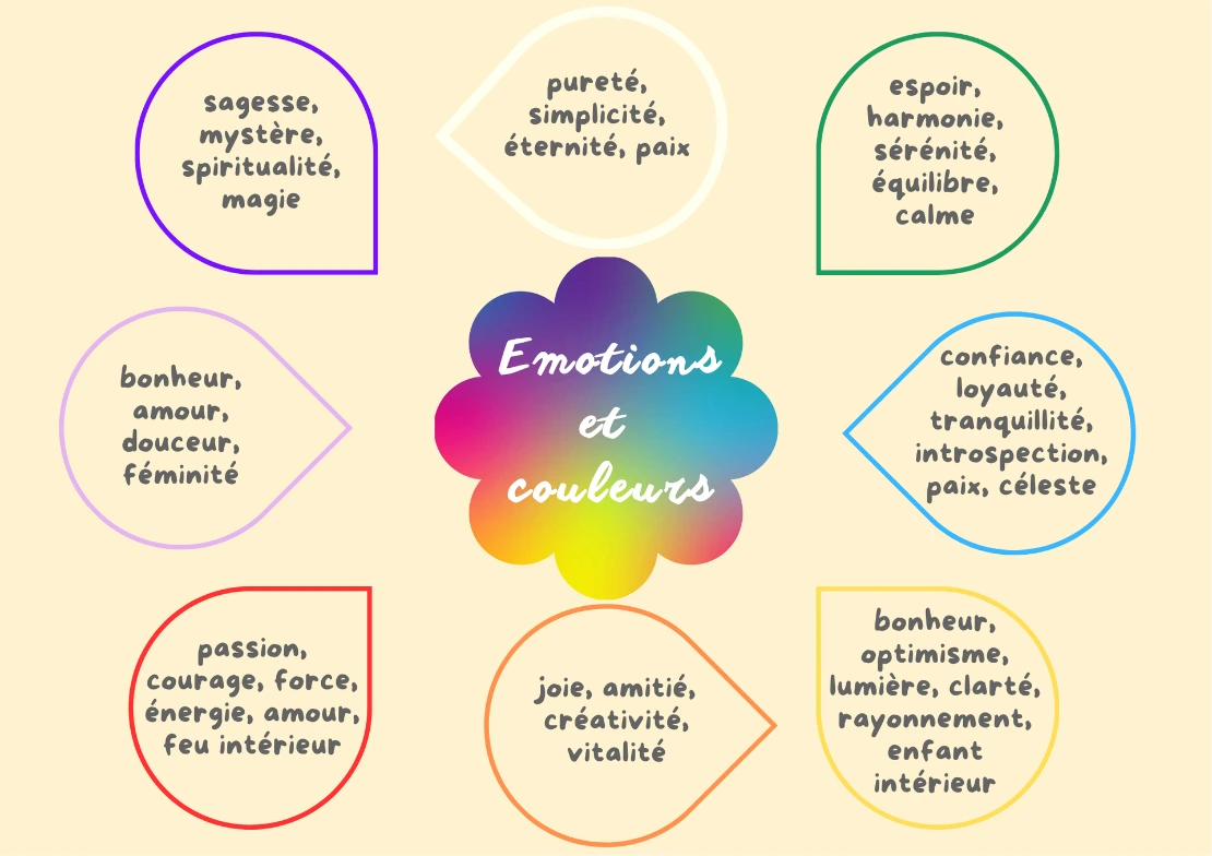 Les couleurs influencent donc directement notre comportement, même sans que nous en soyons conscients. Ici, je vous propose une interprétation possible entre émotions et couleurs. Cependant, il n'y a pas de vérité absolue alors laisser-vous également guider par votre intuition.